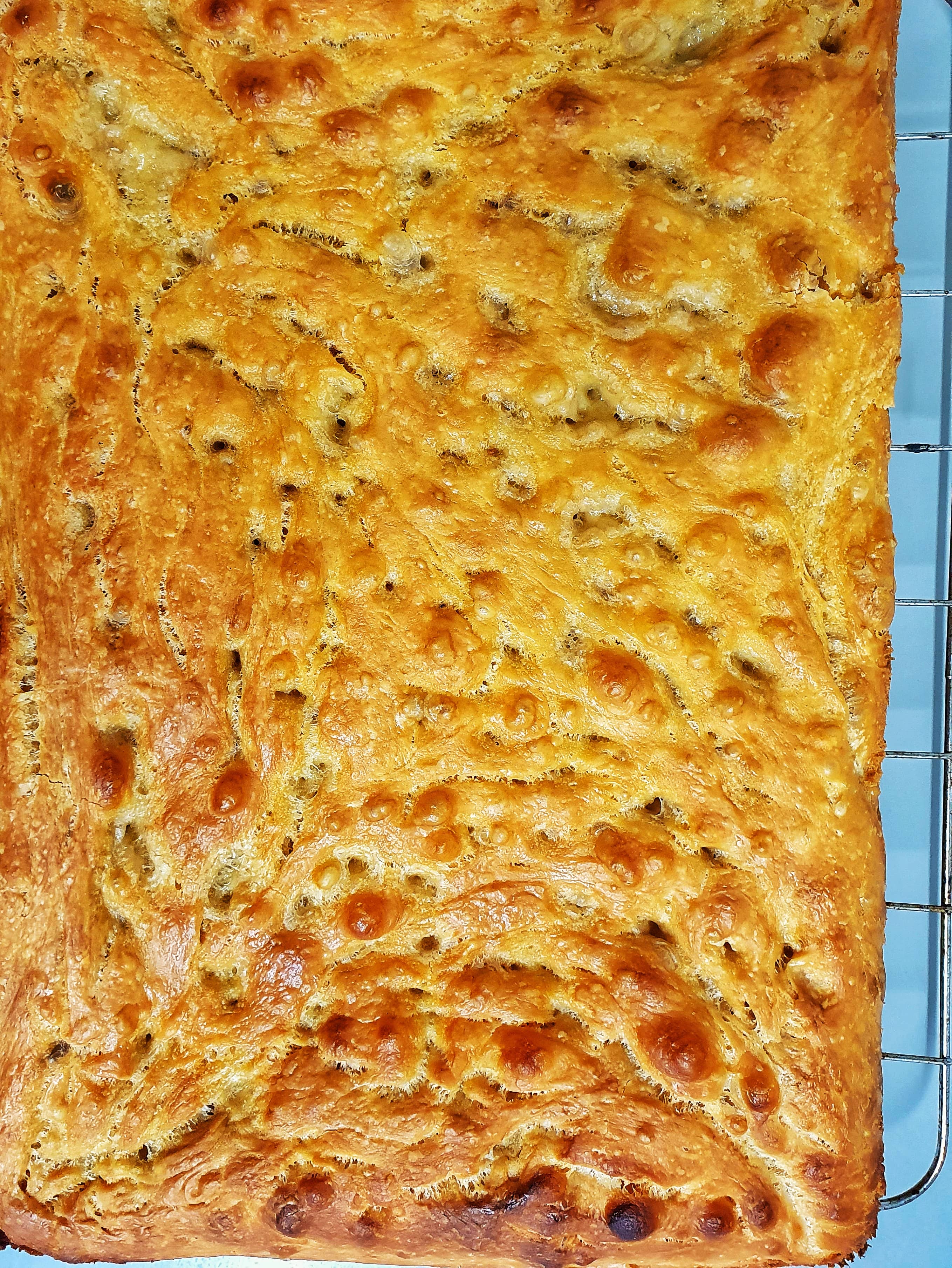 I’ve heard rave reviews about this. On the Netflix series, it looks TO DIE FOR. Let’s give it a go. I’ve got ample time to wait for dough to endlessly rise, as the recipe asks for. After about 17 hours of patience, out it comes from the oven. Instantly, I could tell this was the one. It was OILY, it was BUBBLY, it was light and airy. It was overbaked on the top. In all my excitement and idiocy, I didn’t turn the oven temperature down, accounting for the fan oven. This thing was CRUNCHY. Tooth shatteringly crunchy.